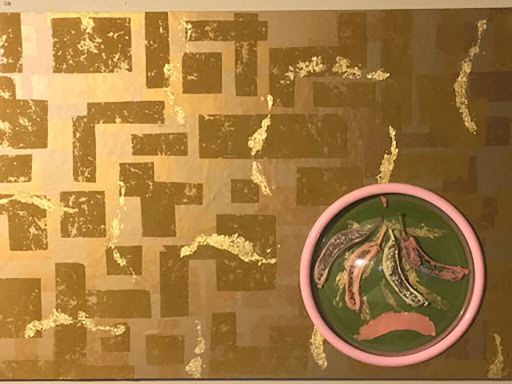 Materials: Wallpaper, Gold Leaf, Acrylic Dome, Resin